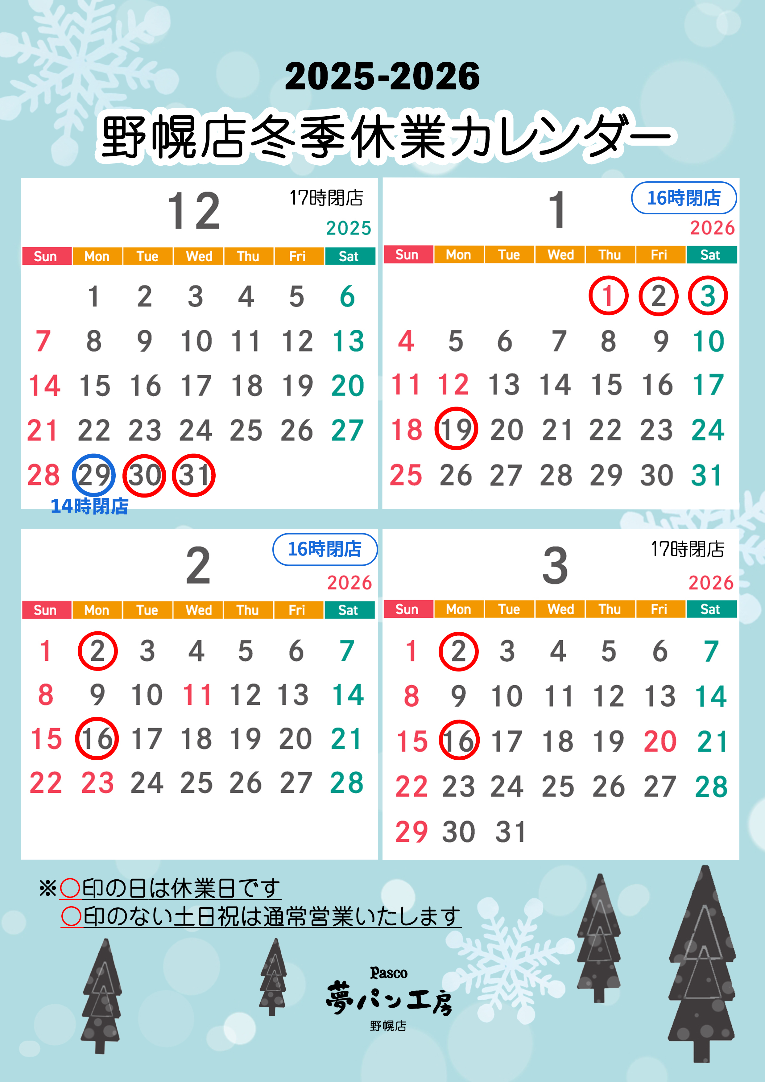 Pasco夢パン工房野幌店 冬季休業カレンダー【2025-2026】